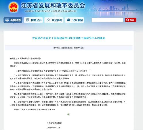 | 中心獲批“江蘇省2018年省級工程研究中心(省級創新平臺)” |