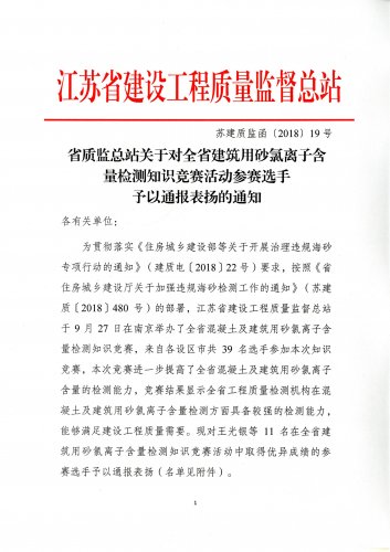 | 省質監總站關于全省建筑用砂氯離子含量檢測知識競賽活動參賽選手予以通報表揚的通知 |
