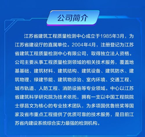 江蘇省建筑工程質量檢測中心成立于1985年3月,作為江蘇省建設廳的直屬單位,以江蘇省建筑科學研究院為技術依托,成為綜合一級資質的省級質檢機構。中心同時經江蘇省質 ..