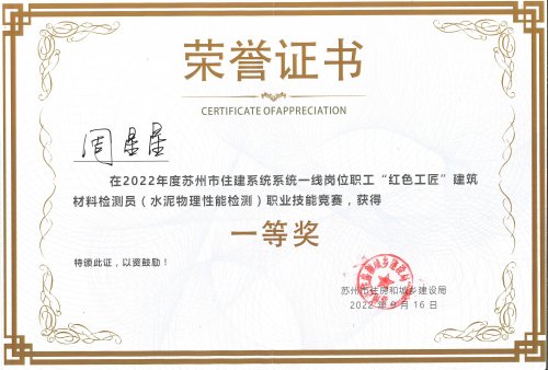 近日,由蘇州市住房和城鄉建設局、蘇州市總工會、蘇州市人力資源和社會保障局、共青團蘇州市委聯合主辦的2022年度蘇州市住建系統一線崗位職工“紅色工匠”建筑材料檢測員(水泥物理性能檢測)職業技能競賽活動在蘇州順利開展。中心蘇州地區員工積極報名參加,其中,子公司蘇州工業園區建設工程質量檢測咨詢服務有限公司(以下簡稱“蘇州咨詢”)員工周星星喜獲一等獎。